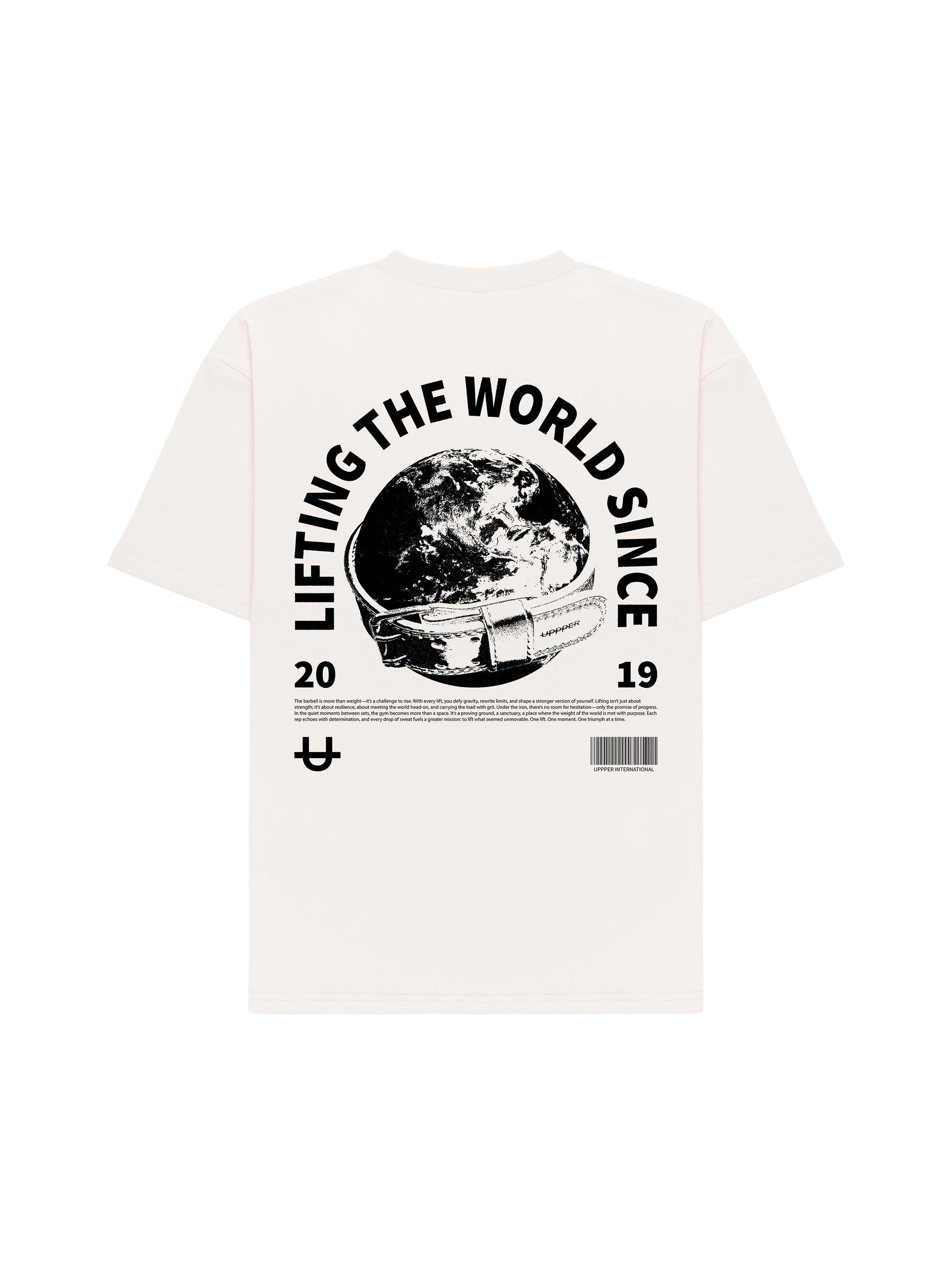 Embrace the power of purpose with UPPPER's Lifting The World T-Shirt. This creamed-colored t-shirt features a striking black print on the back, showcasing the iconic UPPPER Belt around the world—a symbol of strength, resilience, and unyielding determination.